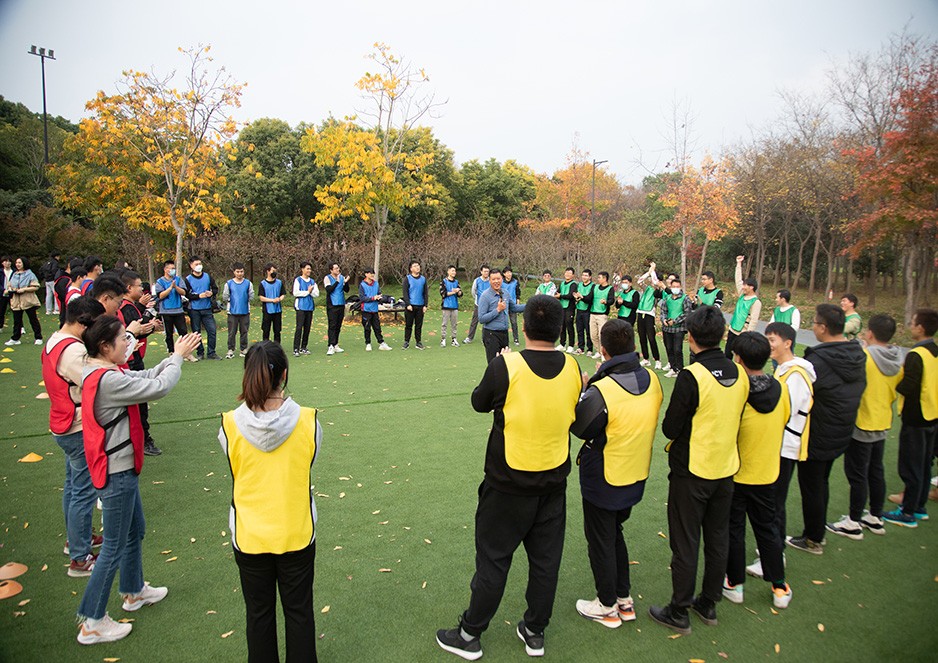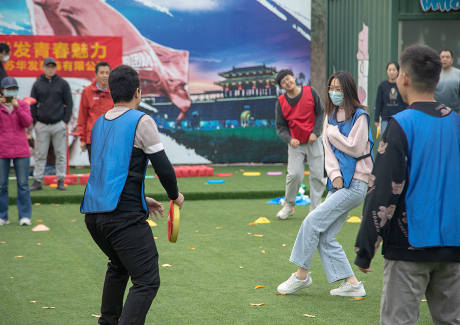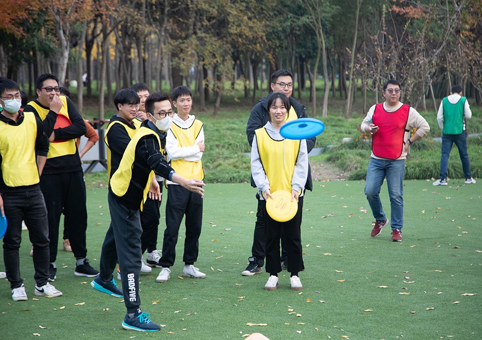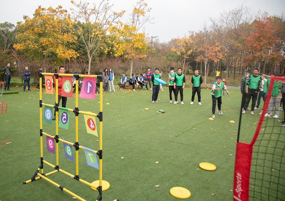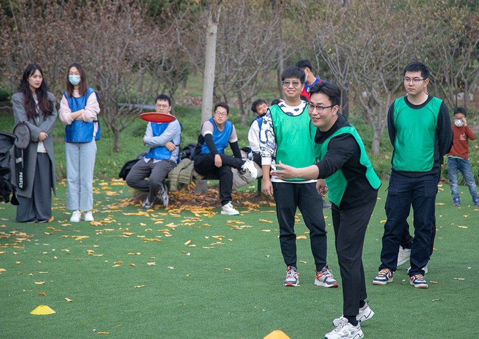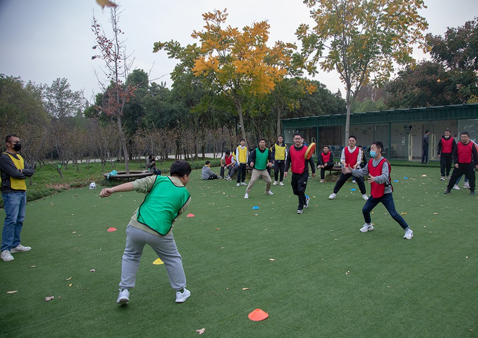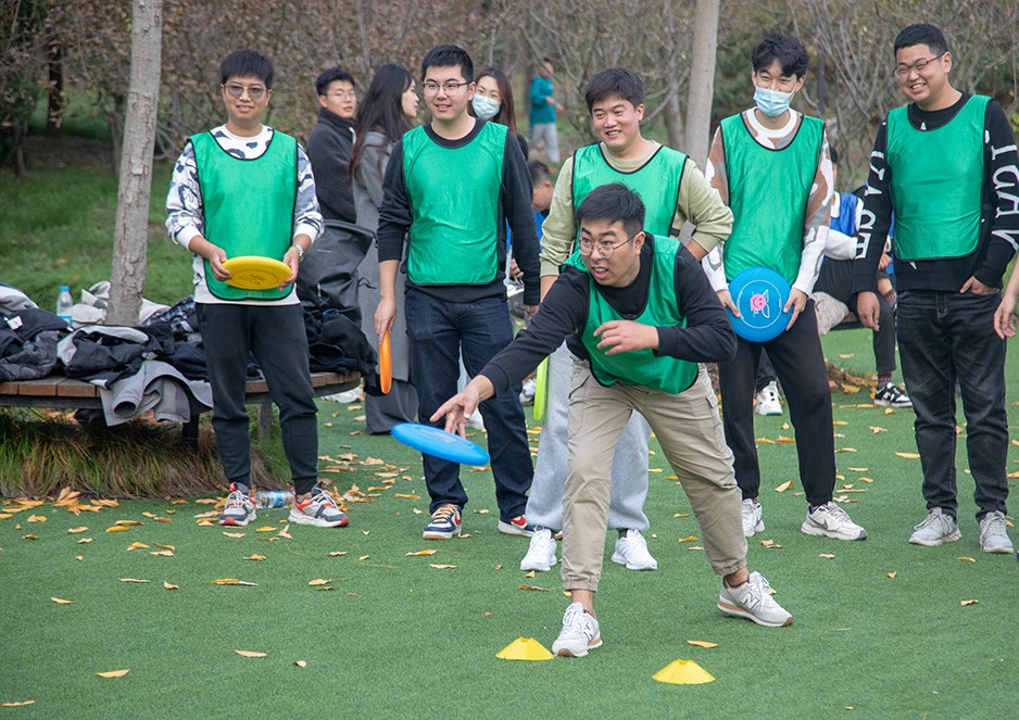 接下来,所有员工报数分为四队,在15分钟内完成了队名、口号、队歌、队旗、队形,并分别进行了分队展示。接着,培训师开展了热身导入,进行了分盘运动介绍、基本动作练习后,并进入到竞技环节,分为飞盘投网、飞盘掷准框、飞盘九宫格、飞盘保龄球、飞盘躲避盘、团队飞盘。在这其中,有自身实力的竞争,让大家对准度的赞扬;有盲掷投中的羡慕,让大家对运气的欢呼;有团队协作的默契,让大家对智慧的钦佩。整个过程中,大家同心协力、勇于拼搏、彼此支持,在欢声笑语的氛围中完成了所有比赛。