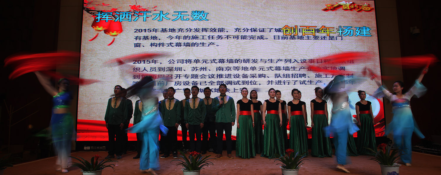 大合唱——《创百年扬建》是我司选择多首曲目旋律的基础上自行填词,经专业声乐、舞蹈老师的编舞、培训而形成的演唱与伴舞相融合的表现形式。同时,分市场开拓篇、品牌创树篇、生产基地篇、企业文化篇四个板块视频背景向集团领导和各兄弟单位展现了我公司2015年所取得的业绩。整个演出从合唱、伴舞、视频三者结合,无论是内容还是形式上,立体地展示了我司员工风貌和公司形象,表达了我司对“创百年扬建”这一扬建人共同梦想的奋斗决心。