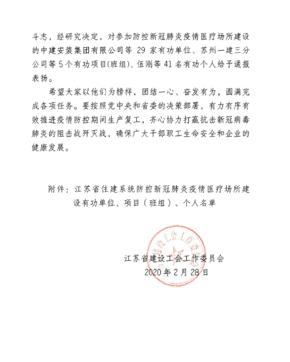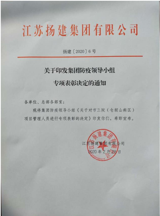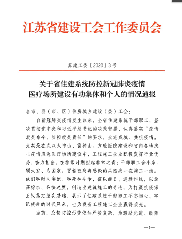 面对汹涌来袭的新冠肺炎病毒疫情,我司迎难而上,火线出击,在极短时间内高效组织力量,克服重重困难,圆满完成了扬州市政府部署的市三院病房改造工程和仓颉山病区建设工程施工任务。公司被中共建工控股公司党委授予“仓颉山病区建设先进集体”荣誉称号。公司陈明被“江苏省建设工会评为省住建系统防控新冠肺炎疫情医疗场所建设有功个人”。公司蒋昭、刘德会获评为集团突出贡献奖;邹宇、王成飞获评为集团一等奖;王鑫、徐生、瞿安森、杨刚、童鑫获评为集团二等奖;吴越、季文华、张宇、田辰、王生华获评为集团三等奖。