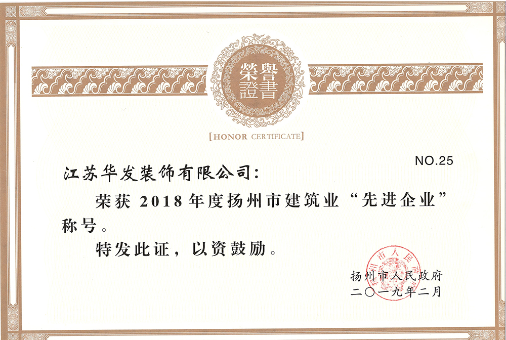 会上,我司再次以扬州市装饰行业综合排名第一位被表彰为“2018年度扬州市建筑业先进企业”,这是公司继1999年参评由市政府表彰的市建筑业先进企业以来连续第二十年荣获此称号;公司蒋文忠被表彰为“2018年度扬州市建筑业先进个人”;公司徐家汇被表彰为“2018年度扬州市建筑企业优秀班组长”。