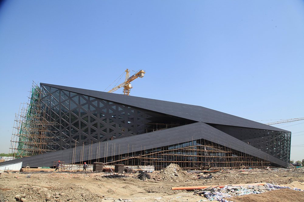 经过55天的全力奋战,4月16日,东南西北四个外立面脚手架全部拆除,外装任务圆满完成。放眼望去,整个体育馆整体呈”V”字形状,高高屹立、线条分明、有棱有角、张扬有力,充满现代感,体现着现代体育更高、更快、更强的精髓。