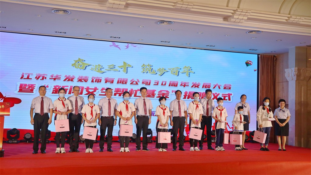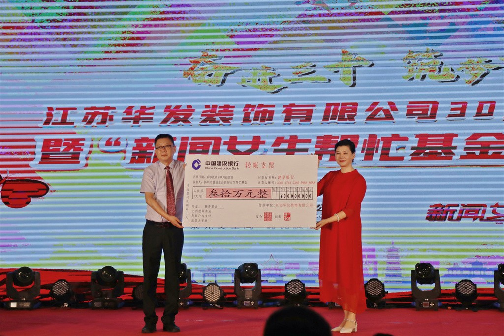 9月15日下午,华发公司30周年发展大会暨“新闻女生帮忙基金”捐赠仪式在扬州西园大酒店隆重拉开帷幕。本次活动主题为“奋进三十、筑梦百年”。扬州慈善总会会长洪锦华、扬州市政协副主席丁一、扬州市人大常委会副主任蒋爱祥、江苏省装饰装修行业协会会长王有党、副会长刘瑗、扬州市工商业联合会主席戴凌云、扬州建工控股公司党委书记、董事长王宏、扬州市住房和城乡建设局副局长薛炳宽、江苏扬建集团理事会主席曹德荣、江苏扬建集团有限公司党委书记、董事长康往东、市装饰协会等领导悉数到场,共同庆祝华发公司成立三十周年。