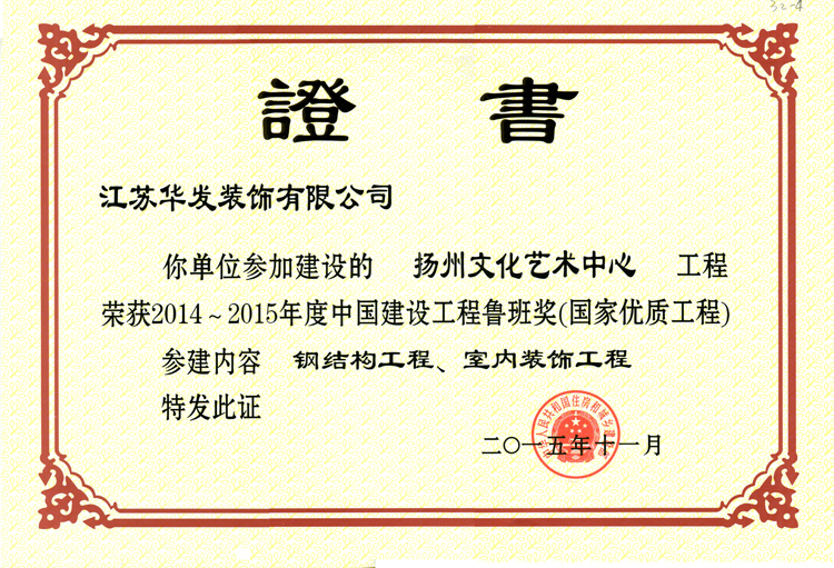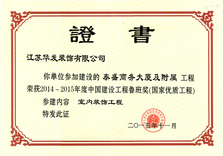 11月17日,2014~2015年度中国建设工程鲁班奖(国家优质工程)表彰大会在北京钓鱼台国宾馆隆重召开,我公司副总经理李浩炜参会。会上,我公司去年参建的扬州文化艺术中心、今年参建的秦皇岛泰盛商务大厦及附属工程(原秦皇岛经济技术开发区投资服务中心内装深化设计及施工工程)荣获“鲁班奖”称号。至此,我公司拥有“鲁班奖”工程4项。