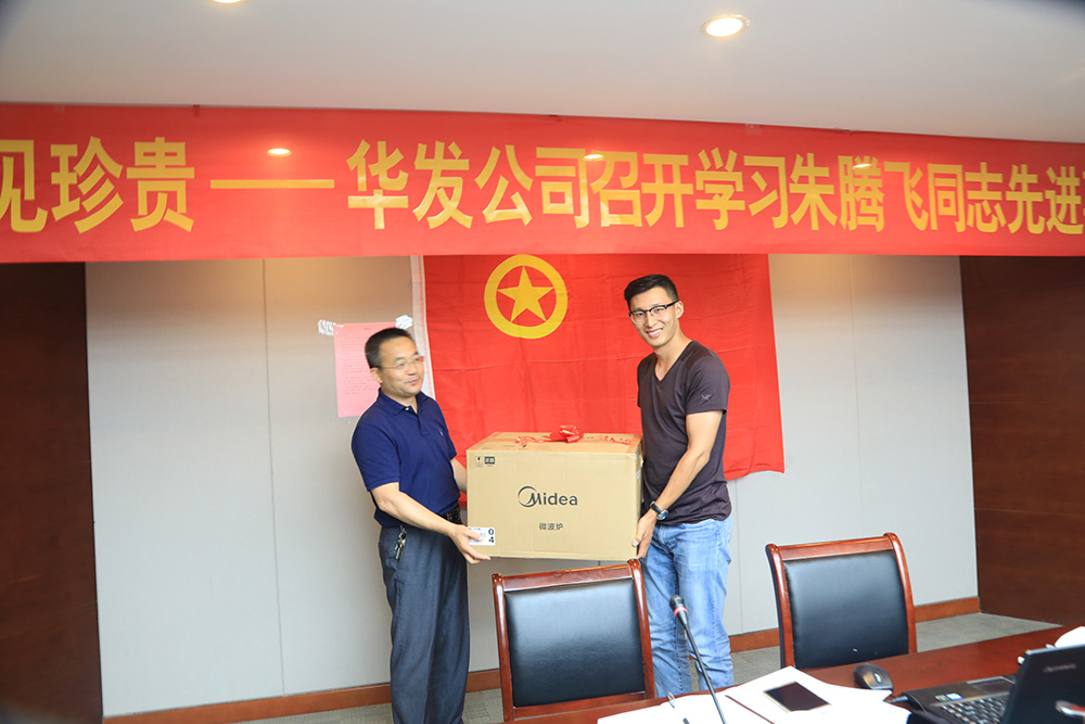李浩炜副书记代表公司对朱腾飞进行了表彰奖励,并号召所有青年员工:学习朱腾飞身上的担当和奉献精神,将饱满高昂的激情投身于工作,为华发的事业尽责、尽心、尽力。