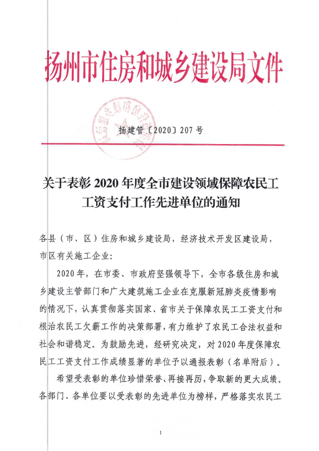 公司荣获2020年度扬州市建设领域农民工工资支付保障工作先进单位称号
