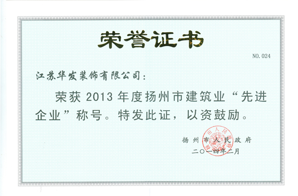 2月7日,华发公司在2014年全市建筑业发展大会上荣获“2013年度扬州市建筑业先进企业”,这是公司继1999年参评由市政府表彰的市建筑业先进企业以来连续第十五年荣获此称号。潘俊被评为“2013扬州市建筑业优秀建造师”。