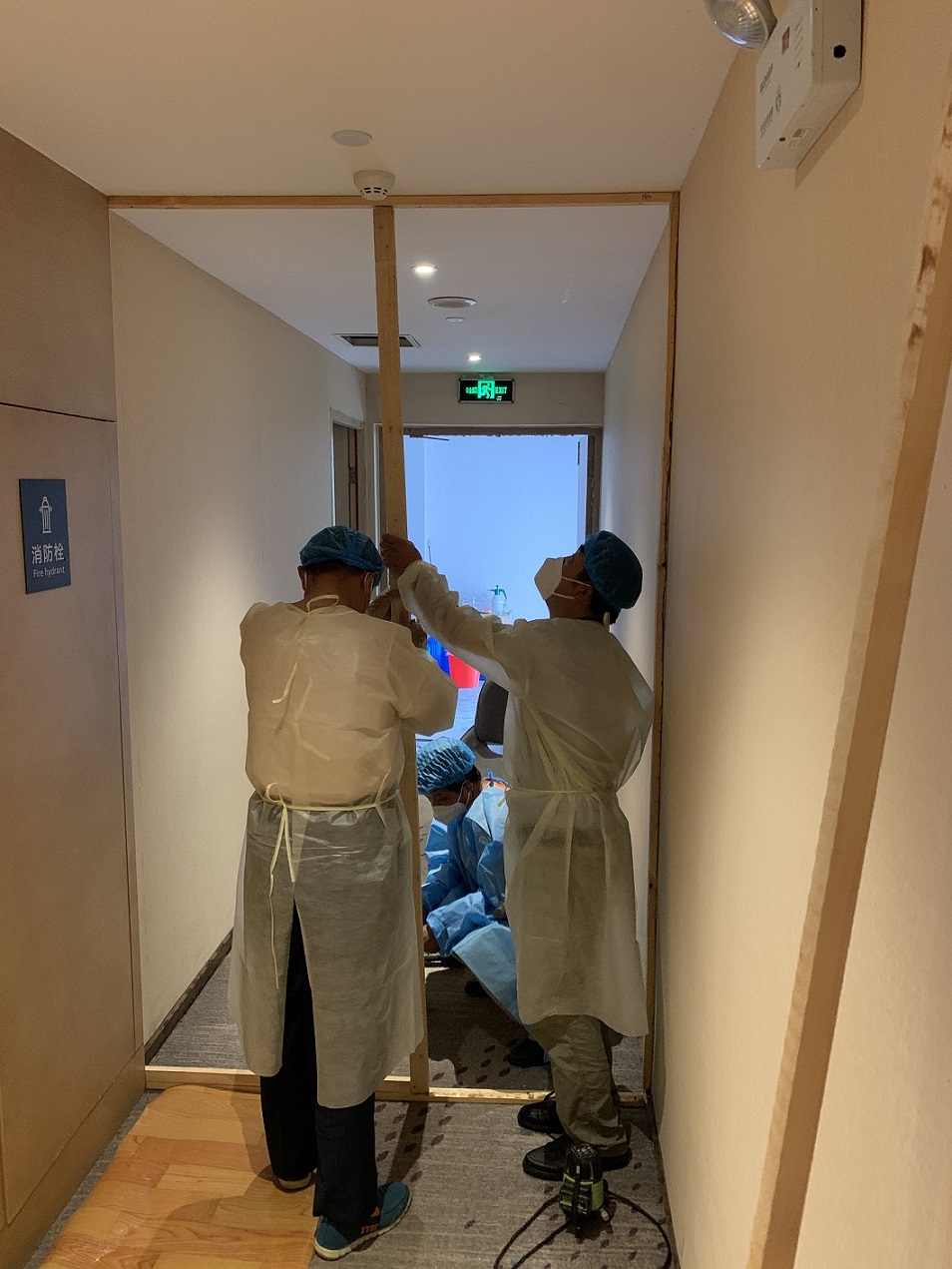 根据省疫情防控专家组对隔离点的要求,隔离点必须具备三区(污染区、半污染区、清洁区)和两通道(隔离人员通道、医护人员通道)。朱志文主要负责对隔离酒店做半污染区的隔断改造。面对疫情期间的材料组织困难,公司积极联系上级办了通行证,去材料商那一次性拉了150张板材和300根木方、螺丝、合叶等。而随着政府的防控要求越来越严,人员组织更是困难。公司虽给3名工人办理了通行证,但工人所住的小区经常不让外出,外出后无法再回小区。无奈之下朱志文联系到一家宾馆给工人解决了住宿问题。